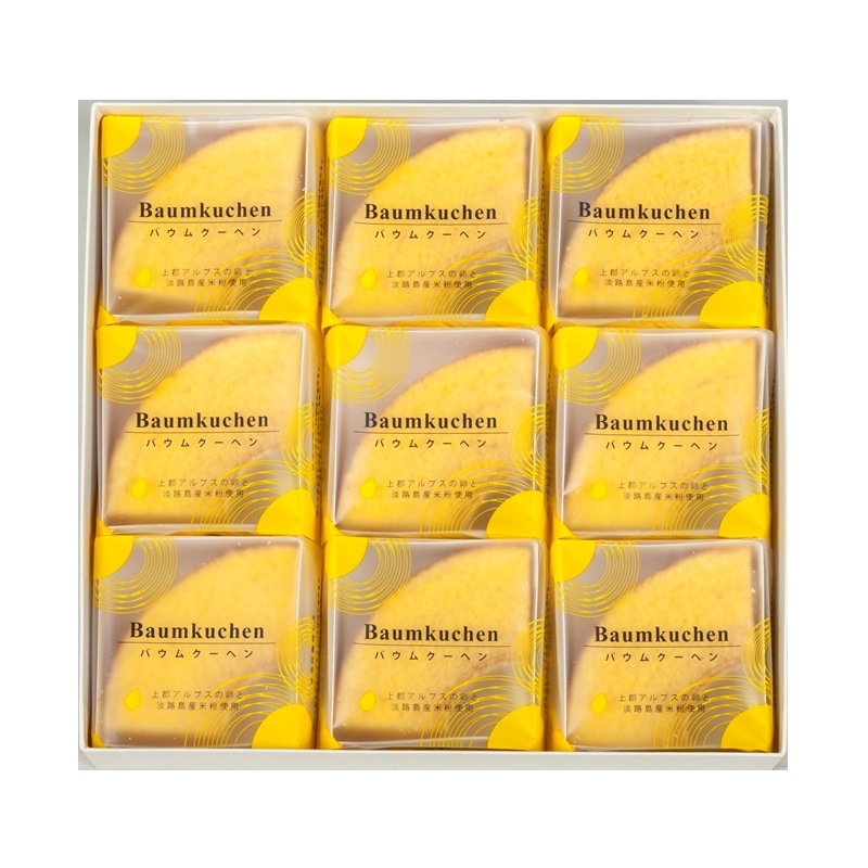 バウムクーヘン カット9個入 円(税込) ・お日持ち:発送日を含めて約10日 ・特定原材料:卵・乳・小麦・大豆を含む 江戸時代より数百年、かすていらを焼き続けてきた千鳥屋宗家の技と心で、厳選したこだわり素材のバウムクーヘンをつくりました。 生地の米粉をブレンドし、独自の蒸し製法で真心をこめて一層一層焼き重ねることで、しっとりくちどけよく仕上げました。 数量 のし・名入れの指定 --- <のしの場所>(選択) ---のしの場所:指定なし外のし内のし--- <のしの種類>(選択) ---のしの種類:のしなし御祝内祝(婚礼)内祝(婚礼以外)御礼紅白無地のし御供粗供養志(弔事)黄白無地のし御中元御歳暮御年賀のしの種類:その他(備考欄で指定)--- <のしの名入れ>(選択) ---のしの名入れ:なしご注文者様の苗字ご注文者様のフルネームご注文者様の下のお名前のしの名入れ:その他(備考欄で指定) ※「のしの種類」もしくは「のしの名入れ」で「その他」を選んだ方は、ご注文者情報入力画面の「備考欄」にてご指定ください。 のし・名入れについて カートに入れる