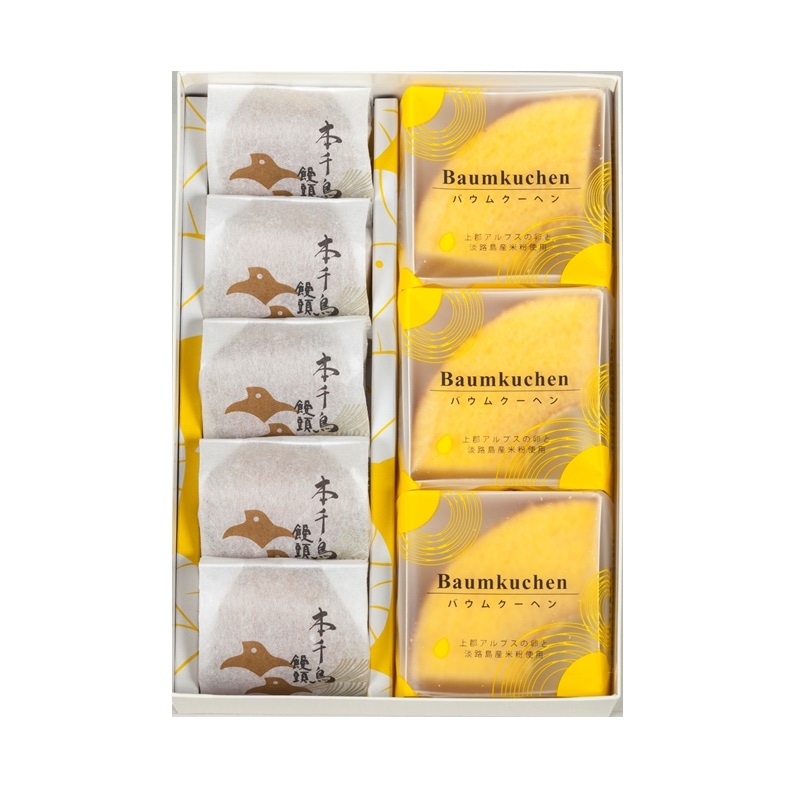 バウムクーヘン詰合せ(カット3・本千鳥饅頭5) 円(税込) ・お日持ち:発送日を含めて約10日 ・特定原材料:卵・乳・小麦・大豆・ごまを含む 江戸時代より数百年、かすていらを焼き続けてきた千鳥屋宗家の技と心で、厳選したこだわり素材のバウムクーヘンをつくりました。 生地の米粉をブレンドし、独自の蒸し製法で真心をこめて一層一層焼き重ねることで、しっとりくちどけよく仕上げました。 数量 のし・名入れの指定 --- <のしの場所>(選択) ---のしの場所:指定なし外のし内のし--- <のしの種類>(選択) ---のしの種類:のしなし御祝内祝(婚礼)内祝(婚礼以外)御礼紅白無地のし御供粗供養志(弔事)黄白無地のし御中元御歳暮御年賀のしの種類:その他(備考欄で指定)--- <のしの名入れ>(選択) ---のしの名入れ:なしご注文者様の苗字ご注文者様のフルネームご注文者様の下のお名前のしの名入れ:その他(備考欄で指定) ※「のしの種類」もしくは「のしの名入れ」で「その他」を選んだ方は、ご注文者情報入力画面の「備考欄」にてご指定ください。 のし・名入れについて カートに入れる